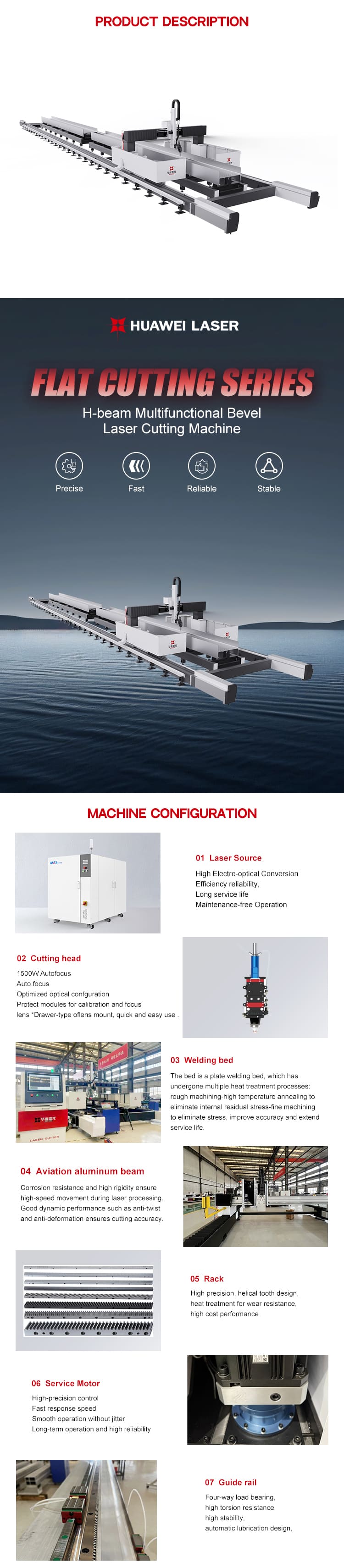 மெட்டல் ஸ்டீல் செயலாக்கத்திற்கான 3D CNC H-பீம் லேசர் கட்டிங் மெஷின் 12000W என்பது Shenyang Huawei Laser Equipment Manufacturing Co., Ltd. வழங்கும் உயர்-துல்லியமான தொழில்துறை தீர்வாகும். H-பீம்கள், எஃகு கட்டமைப்புகள் மற்றும் 20 கனரக உலோகக் கூறுகள் ஆகியவற்றைத் திறம்பட வெட்டுவதற்காக வடிவமைக்கப்பட்டுள்ளது. வேகமான வேகம், ஆழமான ஊடுருவல் மற்றும் மென்மையான வெட்டு விளிம்புகளை உறுதி செய்வதற்கான உயர்-சக்தி ஃபைபர் லேசர் மூலம். 3D CNC கட்டுப்பாட்டு அமைப்பு சிக்கலான மற்றும் துல்லியமான வெட்டு, பெரிய அளவிலான கட்டுமானம், கப்பல் கட்டுதல், இயந்திரங்கள் உற்பத்தி மற்றும் எஃகு செயலாக்கத் தொழில்களின் தேவைகளைப் பூர்த்தி செய்ய அனுமதிக்கிறது. நிலையான செயல்திறன், குறைந்த பராமரிப்பு மற்றும் நீண்ட சேவை வாழ்க்கையுடன், இந்த இயந்திரம் தொழிற்சாலை-நேரடி விலையை மேம்பட்ட தொழில்நுட்பத்துடன் ஒருங்கிணைக்கிறது, இது கனரக தொழில்துறை உலோக வெட்டுக்கான உங்கள் நம்பகமான தேர்வாக அமைகிறது.